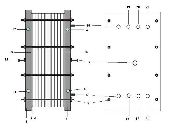 (1)陽(yáng)極導(dǎo)流板;(2)彈性隔板;(3)膜;(4)陰極導(dǎo)流板;(5) 陰極液進(jìn)水口;(6)陰極液出水口;(7)緊固螺栓;(9)陰極接線柱;(11)陽(yáng)極液進(jìn)水口;(12)陽(yáng)極液出水口;(13)陽(yáng)極接線柱;(14)陰極;(15)陽(yáng)極;