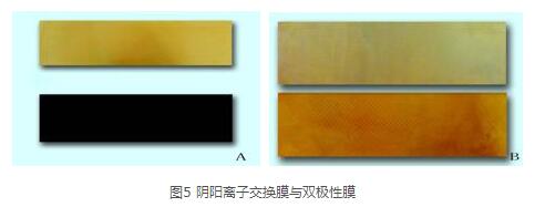 陽膜為苯乙烯系磺酸型均相陽離子交換膜(JCM-Ⅱ)(圖5A下);陰膜為苯乙烯季銨型均相陰離子交換膜(JAM-Ⅱ) (圖5A上);雙極膜為苯乙烯系陽面為磺酸型,陰面為季銨型均相雙極性膜(BPM-Ⅰ)(圖5B)。雙極膜電滲析器中的這三種膜均為我公司自主研發(fā)生產(chǎn)。在外加直流電場力的作用下,陰膜只讓陰離子通過而阻擋陽離子,陽膜只讓陽離子通過而阻擋陰離子,雙極膜的陰,陽膜界面層的水分子解離產(chǎn)生OH-和H+并分別通過陰、陽層給相鄰隔室提供OH和H+;它們具有耐強(qiáng)酸、強(qiáng)堿,柔韌度強(qiáng),機(jī)械強(qiáng)度高,使用壽命長等特點(diǎn)。各膜性能指標(biāo)如下: